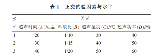 將樺褐孔菌粉末過篩, 準確稱取 5 g 粉末溶于 30%的乙醇溶液中,分別改變提取條件為提取溫度、 提取時間、料液比以及超聲功率,用 80%的乙醇溶 液沉淀多糖后,4 000 r / min 離心 7 min 后取上清液, 減壓濃縮至浸膏后水浴至干,得粗制多糖,通過標準 曲線的方法測定含量。
