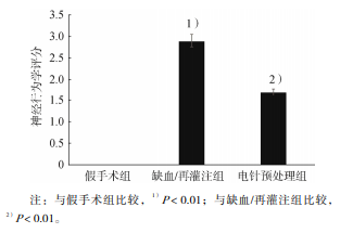 假手術組無神經功能喪失;缺血/再灌注組神經 行為學改變明顯,大鼠左前肢明顯不能充分伸展, 或向左環行運動,出現輕度局灶神經功能喪失,或 向左側倒,出現中度局灶神經功能喪失;電針預處 理組神經行為學癥狀較缺血/再灌注組明顯減輕。 缺血/再灌注組神經行為學評分明顯高于假手術組 (P<0.01);缺血/再灌注組和電針預處理組神經 行為學評分分別為 2.95±0.22 和 1.75±0.64,電針 預處理組明顯低于缺血/再灌注組(P<0.01)。見 圖 1。
