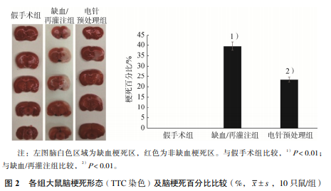 60 只體質量 220~240 g 的 SPF 級 3 月齡雄性 SD 大鼠(三峽大學實驗動物中心,許可證號: SCXK(鄂)2012-0068),按照隨機數字表分為假手 術組、缺血/再灌注組和電針預處理組,每組 20 只。飼 養于湖北中醫藥大學實驗動物中心,室溫 20~25 ℃, 光照時間(7:00-19:00)。本實驗過程中對動物的 處置嚴格按照科技部398 號《關于善待實驗 動物的指導性意見》文件要求進行。