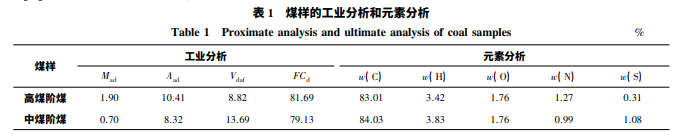 試驗所用煤樣有 2 種,分別是取自山西省中南 部沁水盆地的高煤階煤和山西省左權縣的中煤階 煤。將樣品破碎研磨,過 0.15 mm( 100 目) 篩,在 45 ℃下干燥 6 h 待用,2 種煤樣的工業分析和元素分析 結果見表 1。試驗所用菌種由沁水盆地煤層氣田產 出水經過富集得到。試驗所用培養基主要包括微量 元素、維 生 素、基 礎 培 養 基 和 半 胱 氨 酸 - 硫 化 鈉 溶液。