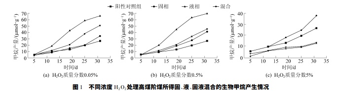 2) 研究結果表明,液相產物單獨降解的甲烷產 量最大,高煤階煤可達 68 μmol /g,增產 161%; 中煤 階煤可達 57 μmol /g,增產 338%。高階殘煤降解產 甲烷量隨 H2O2濃度的增大而增大,5%H2O2 處理條 件下的甲烷產量為 38 μmol /g,相比對照組提高了 46%,增產效果突出。
