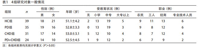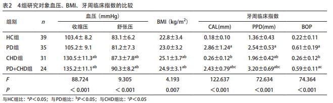 一般情況 各組間性別、年齡、教育程度、職 業(yè)情況差異無統(tǒng)計(jì)學(xué)意義(P>0.05),在各組基本 平均分布。見表1。其中CHD組、PD+CHD組患者的血 壓、BMI顯著高于HC組和PD組(P<0.05),而HC組 和PD組之間以及CHD組和PD+CHD組之間的血壓、BMI 差異則無統(tǒng)計(jì)學(xué)意義(P>0.05)。見表2。CAL除HC組與CHD組間差異無 統(tǒng)計(jì)學(xué)意義外,在其余組間差異均有統(tǒng)計(jì)學(xué)意義 (P<0.05);PD組的CAL值最高,HC組和CHD組最低。 所有組間PPD差異均有統(tǒng)計(jì)學(xué)意義(P<0.05);PD+ CHD組、PD組、CHD組、HC組依次下降。除HC組與 CHD組間、PD組與PD+CHD組間BOP差異無統(tǒng)計(jì)學(xué)意 義外,其余組間BOP差異均有統(tǒng)計(jì)學(xué)意義(P<0.05); PD組、PD+CHD組高于HC組和CHD組。見表2。