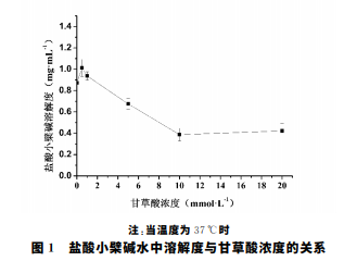 如圖1所示,選用不同濃度甘草酸后,隨著濃度的增加, 鹽酸小檗堿溶解度隨之下降。當(dāng)甘草酸濃度為10mmol·L-1 時(shí),此時(shí)鹽酸小檗堿的溶解度最低,與純水中的溶解度相比, 溶解度下降了2.3倍。繼續(xù)加大甘草酸的濃度后,鹽酸小檗 堿的溶解度變化不明顯。