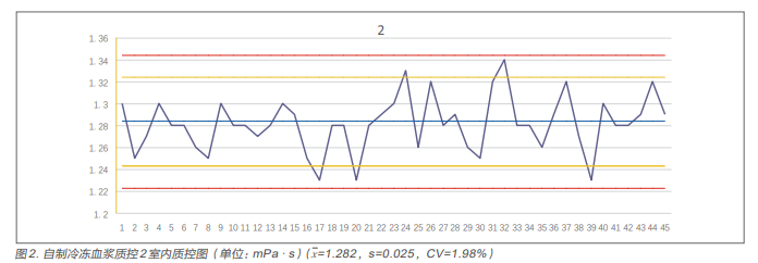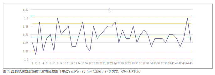 先將SA-7000血流變儀進行日常的維護、清洗和保養, 對血漿黏度做定標校準,取上述兩份分別編號為質控1和質 控2的自制冷凍新鮮血漿各5mL,二者各重復測定20次,經 過統計學處理,分別計算出它們的均值x及標準差s,作為 各自的靶值及靶值范圍。隨后每天取自制冷凍血漿質控1和 質控2各一支,置于37?C水浴箱中溫浴約15min,使其復溶 后立即取出。然后二者與當天常規標本一同檢測得出結果并 記錄。自制室內質控連續開展45個工作日并同時繪制質控 圖表,觀察分析結果。