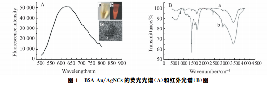 圖1A 為 BSA-Au/AgNCs在激發波長280nm 處的熒光光譜圖,由圖可見最大發射波長為625nm。 這些熒光特征與報道的基本一致,表明實驗已經成功合成了 BSA-Au/AgNCs。日 光 下 制 備 的 BSA-Au/AgNCs呈棕黃色(如圖1A 插圖a),而在365nm 的紫外燈下顯示出很強的橘紅色熒光,如圖1 插圖b所示。 圖1 BSA-Au/AgNCs的熒光光譜(A)和紅外光譜(B)圖 Fig.1 Fluorescencespectra(A)andIRspectra(B)ofBSA-Au/AgNCs InsetainFig.A:ImageofBSA-Au/AgNCsunderthedaylightlamp;Insetb:ImageofBSA-Au/AgNCsunder365nm UVlight; Insetc:HRTEMimageofBSA-Au/AgNCs. 利用高分辨透射電鏡(HRTEM)研究了合成的 BSA-Au/AgNCs的尺寸。如圖1插圖c所示,可以觀 察到合成的 BSA-Au/AgNCs尺寸約4nm,表明 BSA-Au/AgNCs具有高度結晶的結構。利用紅外光譜 表征了 BSA-Au/AgNCs的結構信息,結果如圖1B所示。其中曲線a為 BSA-Au/AgNCs的紅外譜,曲線 b為 BSA 的紅外光譜。與 BSA 的紅外光譜相比,BSA-Au/AgNCs的紅外光譜在1654cm-1的特征吸收 峰有較為明顯的減弱,這表明反應后蛋白質的α 螺旋結構減少了,蛋白質的二級結構發生了改變,同時在 蛋白質中巰基與 Au、Ag形成共價鍵。