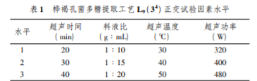 設(shè)計樺褐孔菌多糖提取物單因素試驗的變量條件分別為: 提取 溫度,20、30、40、50、80 ℃ ; 提取時間,10、20、30、40、50 min; 料 液比 1 g ∶ 8 mL、1 g ∶ 10 mL、1 g ∶ 15 mL、1 g ∶ 20 mL、 1 g ∶ 25 mL; 超聲功率,160、320、400、480、640 W,從而來確定 正交試驗中各因素的水平。