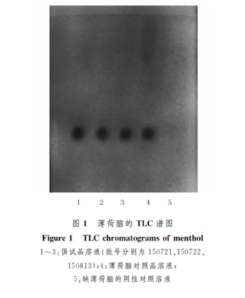 取復(fù)方薄荷酚酸酊(批號 150721、150722、150813)適量 作 為 供 試 品 溶 液。取 薄荷腦對照品加甲醇制成濃度為10mg/ml的對照 品溶液。按照制劑處方制備不含薄荷腦的復(fù)方薄荷 酚酸酊陰性 樣 品,取陰性樣品適量作為陰性對照。 按2015年版藥典四部 TLC 實驗 操 作 方 法,吸取 上述3種溶液各2μl,分別點于同一硅膠 G 薄層板 上,以甲苯-乙酸乙酯(V∶V=19∶1)為展開 劑,展 開,取出,晾干,噴以5%香草醛濃硫酸-乙醇(1∶4) 的混合溶液,在105 ℃加熱至斑點顯色清晰。在供 試品色譜中,與對照品色譜相應(yīng)的位置上,顯相同顏 色的斑點,陰性對照色譜無相應(yīng)斑點,見圖1。 2.2 乙醇含量測定 取1.2項下10個批次的復(fù)方 薄荷酚酸酊,各精密量取25ml,置150~200ml蒸 餾瓶中,加水約50ml。按照2015年版藥典四部通則 0711乙醇量測定法第二法蒸餾法,測定樣品中乙 醇的含量,每批次平行測定2份。結(jié)果顯示,樣品中 乙醇的含量為44%~50%,平均 值 為47%,擬定復(fù)方薄荷酚酸酊中乙醇的量在42%~52%。