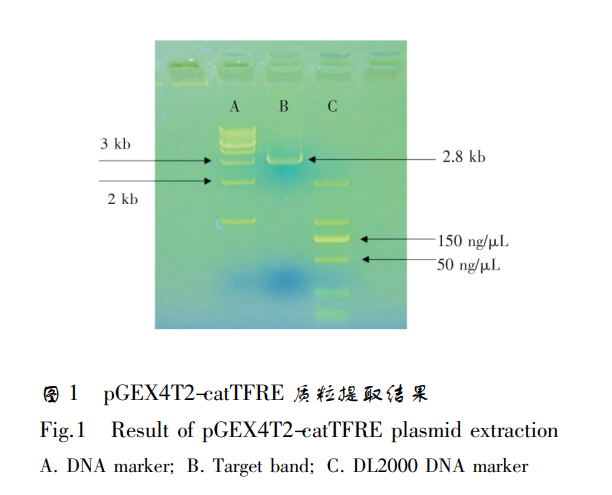 catTFRE DNA 的純化與回收 catTFRE DNA 經瓊脂糖凝膠電泳后,切下目的條帶, 使用 DNA 凝膠試劑盒回收、純化,測定濃度后分裝,!20℃保存,備用。