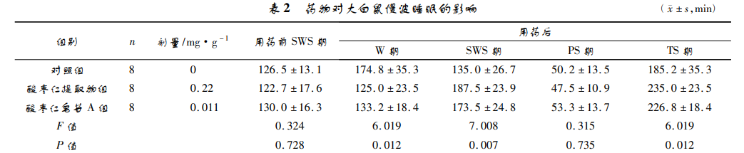 灌胃 20 d 后酸棗仁提取物組、酸棗仁皂苷 A 組體長明顯優(yōu)于 對照組,差異有統計學意義( P < 0. 01) ,酸棗仁提取 物組和酸棗仁皂苷 A 組比較,差異無統計學意義, 說明酸棗仁提取物和酸棗仁皂苷 A 都可以明顯增 加生長發(fā)育期小白鼠的體長,兩者作用相當。見表 1。酸棗仁皂苷 A 可以促進大白鼠慢波睡眠時間( P < 0. 05) ,酸棗 仁提取物也可以明顯促進大白鼠慢波睡眠,與對照 組比較,差異有統計學意義( P < 0. 01) ,說明藥物可 以延長慢波睡眠。而兩組對異相睡眠( paradoxical sleep,PS) 期無影響。由于藥物促進了慢波睡眠,所 以用藥組較對照組總睡眠時間明顯延長,清醒時間 減少,而酸棗仁提取物和酸棗仁皂苷 A 比較,促進 慢波睡眠作用相當。見表 2。