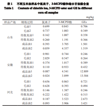 從不同玉米油加工廠取不同批次的毛油、待脫臭油 和成品油,檢測其中氯離子、3-MCPD酯和GEs含量,結(jié) 果如表1所示。
