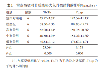 處死大鼠,分離左脛 骨,用4 %多聚甲醛固定3 d,然后10 % EDTA脫鈣5 周,用電鋸從矢狀面剖開,暴露骨髓腔并取左脛骨近 端,制備常規(guī)脫鈣骨組織蠟塊,切4 μm厚骨組織切 片,HE染色,光鏡下觀察骨形態(tài)改變,每張切片選取 5個(gè)視野,取其平均值,利用MOTIC Med 6.0型圖象分 析系統(tǒng)進(jìn)行骨組織形態(tài)測量,計(jì)算骨形態(tài)指標(biāo):平均 骨小梁間距(Tb.sp),平均骨小梁厚度(Tb.Th)。