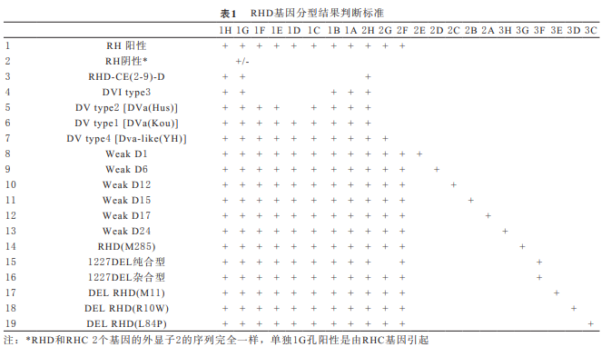 根據(jù)RH基因變異體基因分型檢測(cè)試 劑盒,在擴(kuò)增儀上進(jìn)行基因分型試驗(yàn)。將將100μL dNTP-Buffer濃縮液、140μL去離子水 、2.0μL Taq 酶(5units/μL)和 2 5μL樣本DNA共267μL混合 液;向每個(gè)引物孔(1~24孔)各加入10μL上述混合 液。擴(kuò)增循環(huán)參數(shù):96℃ 2 min ,1 cycle ;96℃20 S/68℃60S ,5 cycles; 96℃20 S/65℃50S /72℃45 S,1 0 cycles;9 6℃2 0 S / 6 2℃5 0 S / 7 2℃4 5 S,2 5 cycles; 72℃2min,1 cycle。吸取5μL擴(kuò)增產(chǎn)物, 加入配制好的2%瓊脂糖凝膠中并進(jìn)行電泳,電泳參 數(shù)設(shè)置為電壓100V,時(shí)間15min。電泳后用凝膠成像 儀進(jìn)行拍照、記錄與分析。基因分型的結(jié)果判斷見(jiàn)表 1。