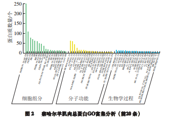 以UniProt/Swiss-Prot蛋白數據庫為背景,對總蛋白 進行鑒定,初步建立察哈爾羊蛋白質表達譜。由圖1可 知,1%假陽性條件下,背最長肌和臀肌中共檢測到蛋白 質1 073 個,其中背最長肌中共檢測到877 個,臀肌中共 檢測到897 個,2 個部位的總蛋白數量相近。對察哈爾羊肌肉總蛋白進行GO組分富集分析,由 圖2可知:在細胞組分中,富集于細胞外外泌體中的蛋白 質數量最多,其次富集于細胞質內的蛋白質數量較多; 在分子功能中,蛋白質主要參與聚RNA結合、ATP結合 和鈣離子結合等功能;在生物學過程中,蛋白質主要參 與三羧酸循環、蛋白質結合和細胞氧化還原穩態等生物 學過程。